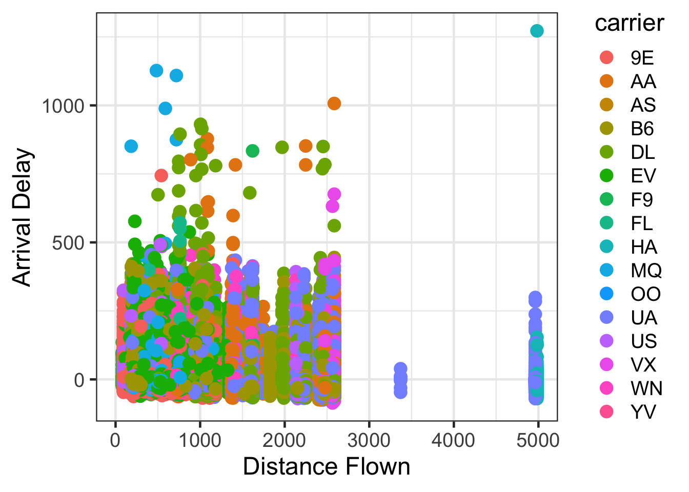 ggplot(flights, aes(x = distance, y = arr_delay, color = carrier)) +